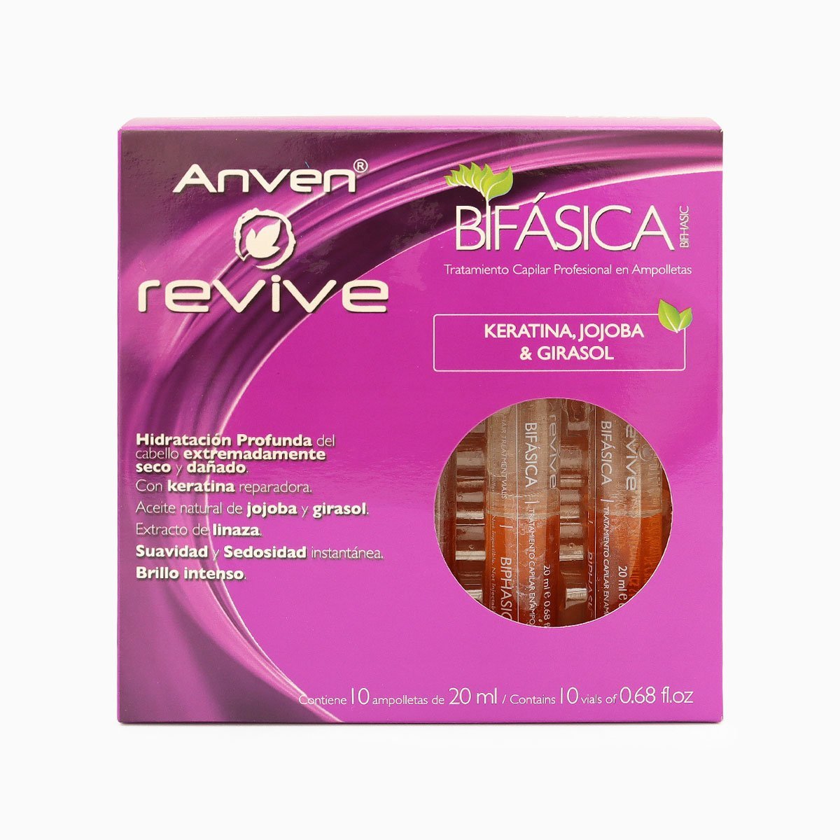 Ampolletas para cabello enriquecida con Keratina, extracto de linaza y aceites naturales de jojoba y girasol que proporcionan hidratación profunda, ayudando a evitar la resequedad y quiebre del cabello provocado por el medio ambiente y procesos químicos. Su fórmula doble fase trabaja de manera inmediata otorgando sedosidad, suavidad y brillo brindando un cabello espectacular.